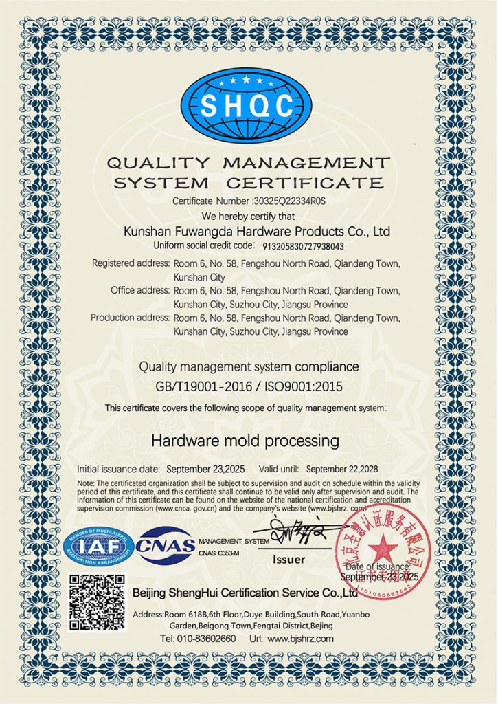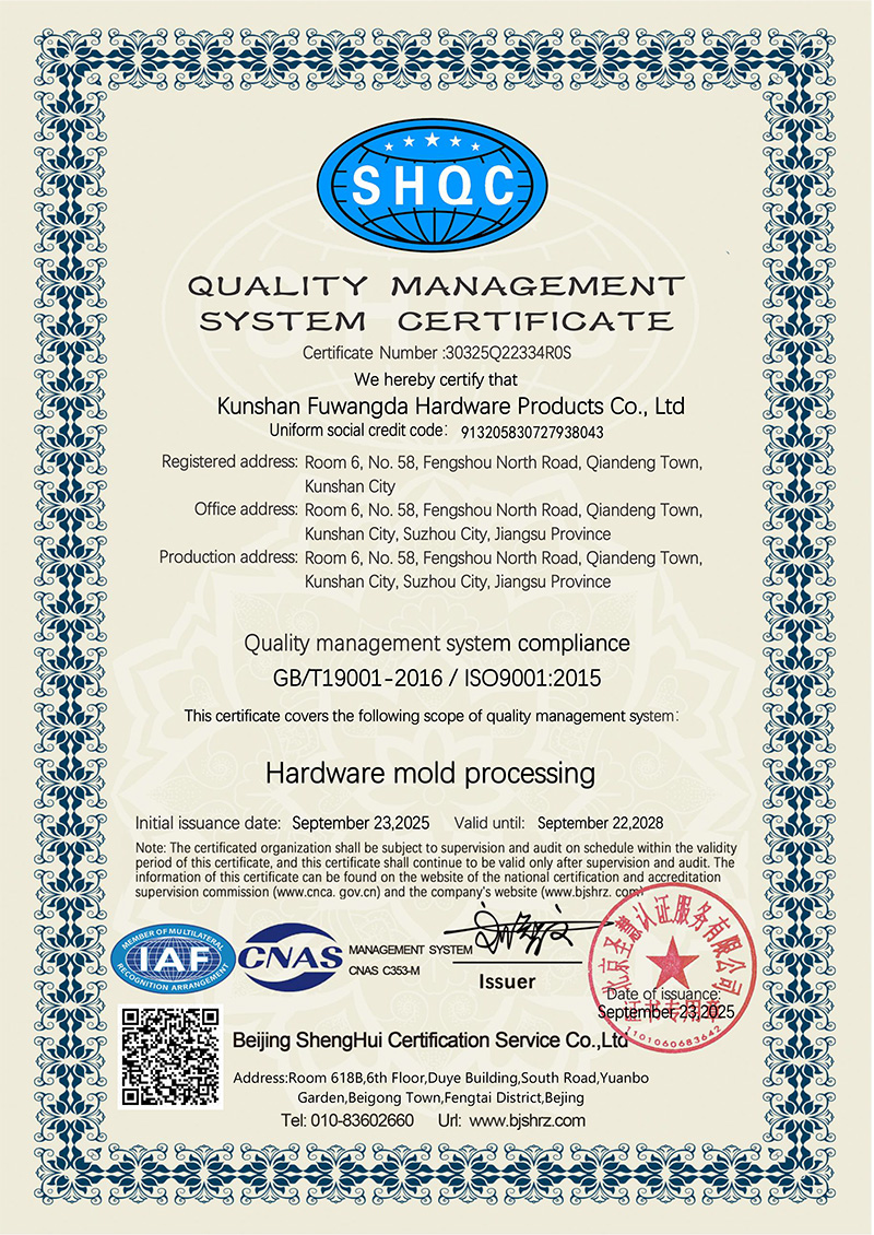 Kunshan Fuwangda, bağlantı elemanları ve standart dışı parçaların araştırma, geliştirme, üretim ve satışında uzmanlaşmış bir şirkettir. Küresel otomotiv, havacılık, hassas elektronik ve diğer bağlantı elemanı endüstrileri için yüksek hassasiyetli ve zorlu, karmaşık metal şekillendirme kalıpları sağlamaktadır.